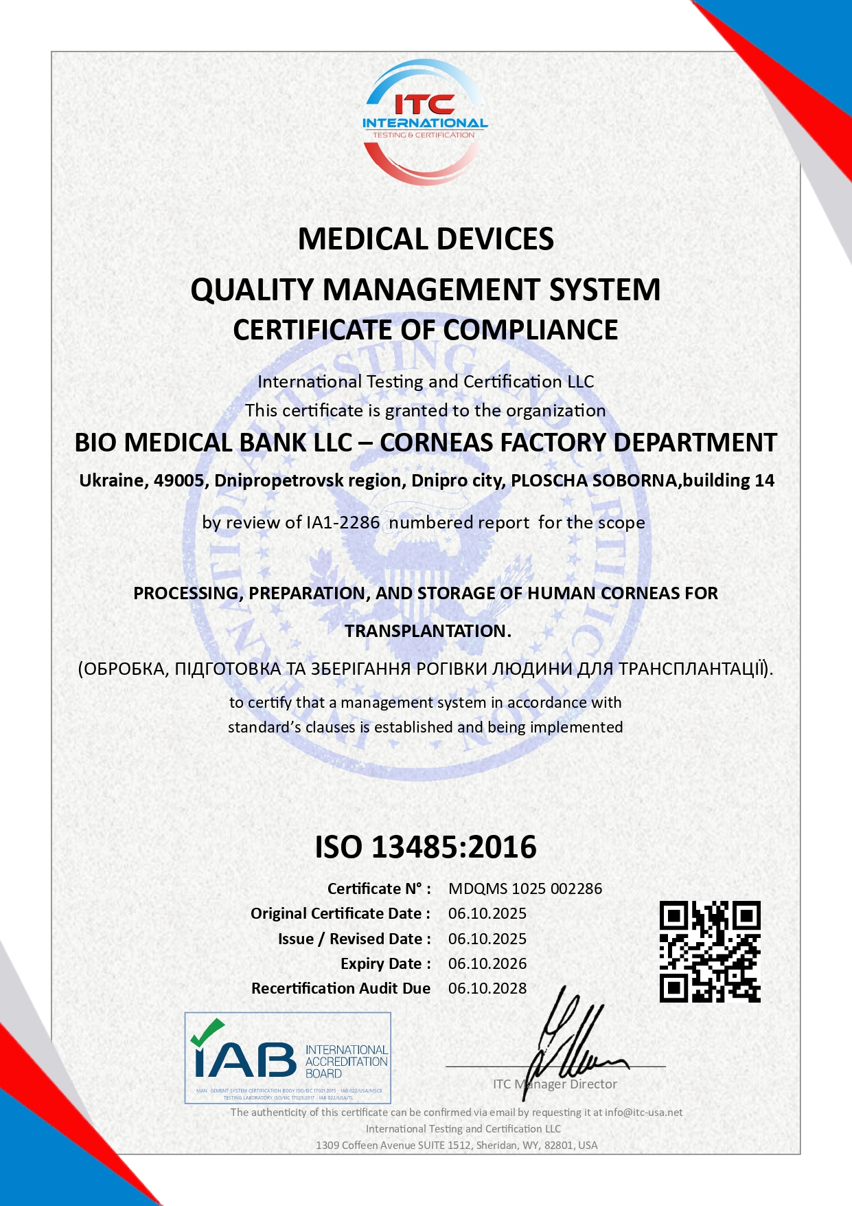 ТОВ «Біо Медікал Банк» успішно пройшло міжнародний аудит та отримало сертифікат ISO 13485:2016 — ключовий стандарт у сфері виробництва медичних виробів. Це визнання підтверджує, що всі процеси підприємства відповідають найвищим вимогам безпеки, контролю ризиків та управління якістю, які застосовуються у провідних медичних компаніях світу.