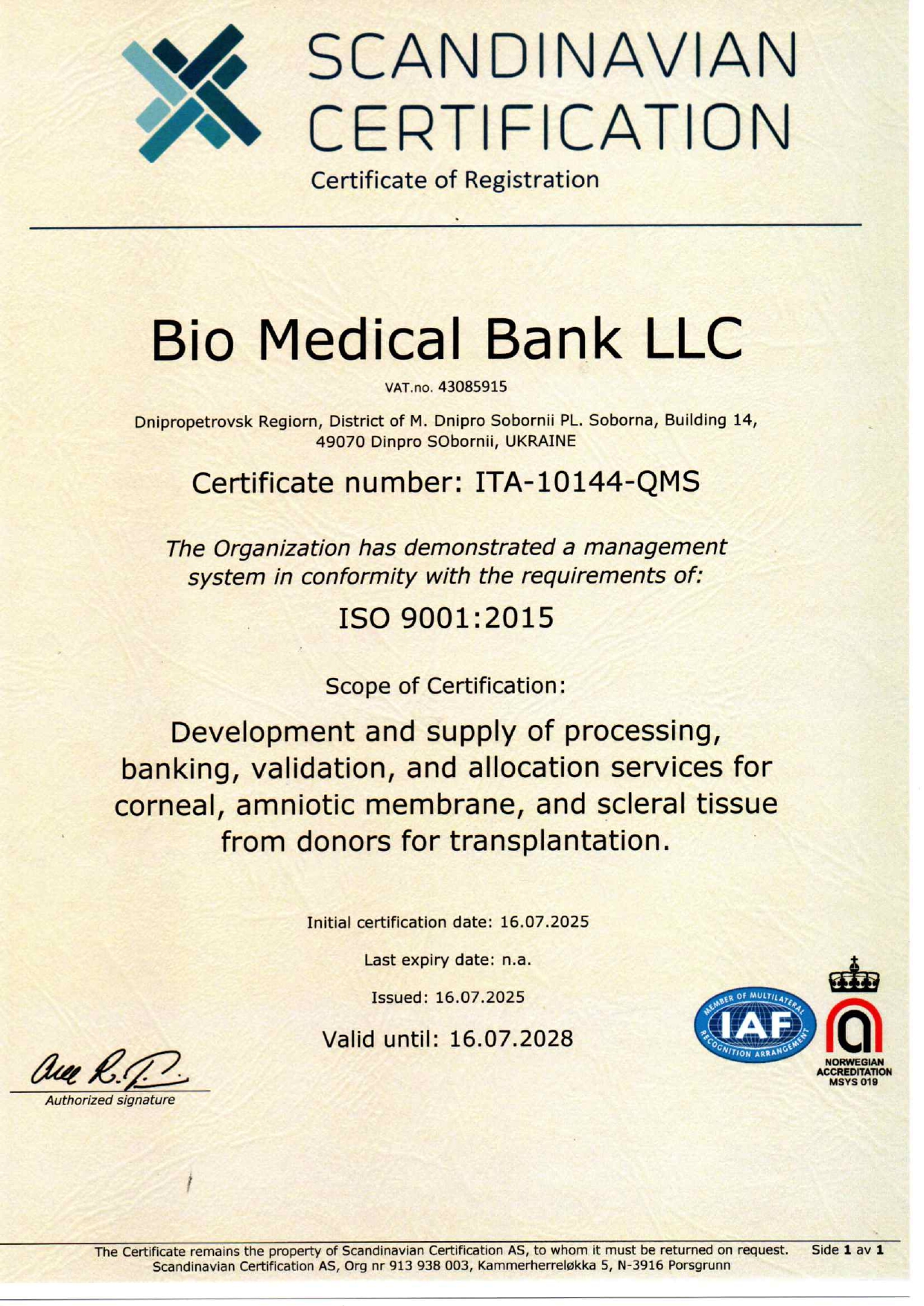 Сертифікація ISO 13485:2016 — важливий етап розвитку ТОВ «Біо Медікал Банк».